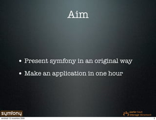 The document outlines a step-by-step guide for creating a blog application using Symfony within one hour, presented by Philippe Gamache, a PHP security expert. It covers installation, project creation, database configuration, plugin installation, and CRUD operations for both blog posts and comments. Additionally, it includes guidance on generating forms, editing templates, and setting up backend functionalities while suggesting further enhancements like adding tags and search features.