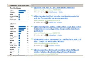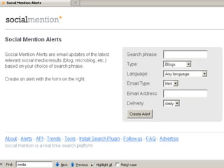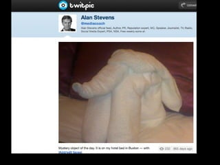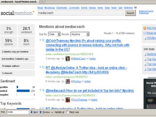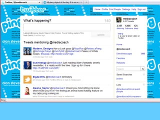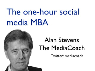 The document outlines The One-Hour Social Media MBA presented by Alan Stevens. It discusses five tools for social media including Socialmention, Klout, Hootsuite, Addictomatic, and Radian 6. It also discusses five techniques such as seeing opportunities, creating stories, building community, being different, and being present. Finally, it discusses five traps to avoid like using tragedy for advertising, forgetting to turn off automated messages, not understanding social media, not monitoring fake brand sites, and forgetting the social aspect of social media.