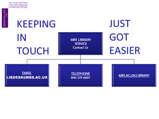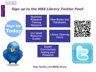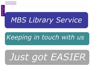 This document provides information on how to keep in touch with the MBS Library through social media channels. It lists the MBS Library Twitter feed and an essential business and management blog as ways to receive updates. It also includes the library website for more information.