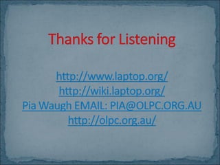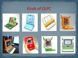 One Laptop per Child (OLPC) is a non-profit organization that provides inexpensive laptops to children in developing countries to help empower them and improve access to education. OLPC was founded by Nicholas Negroponte and develops the XO laptop, which is low-cost, rugged, and optimized for collaborative and self-directed learning. The laptops are designed to be easily customized and used without internet access or training.