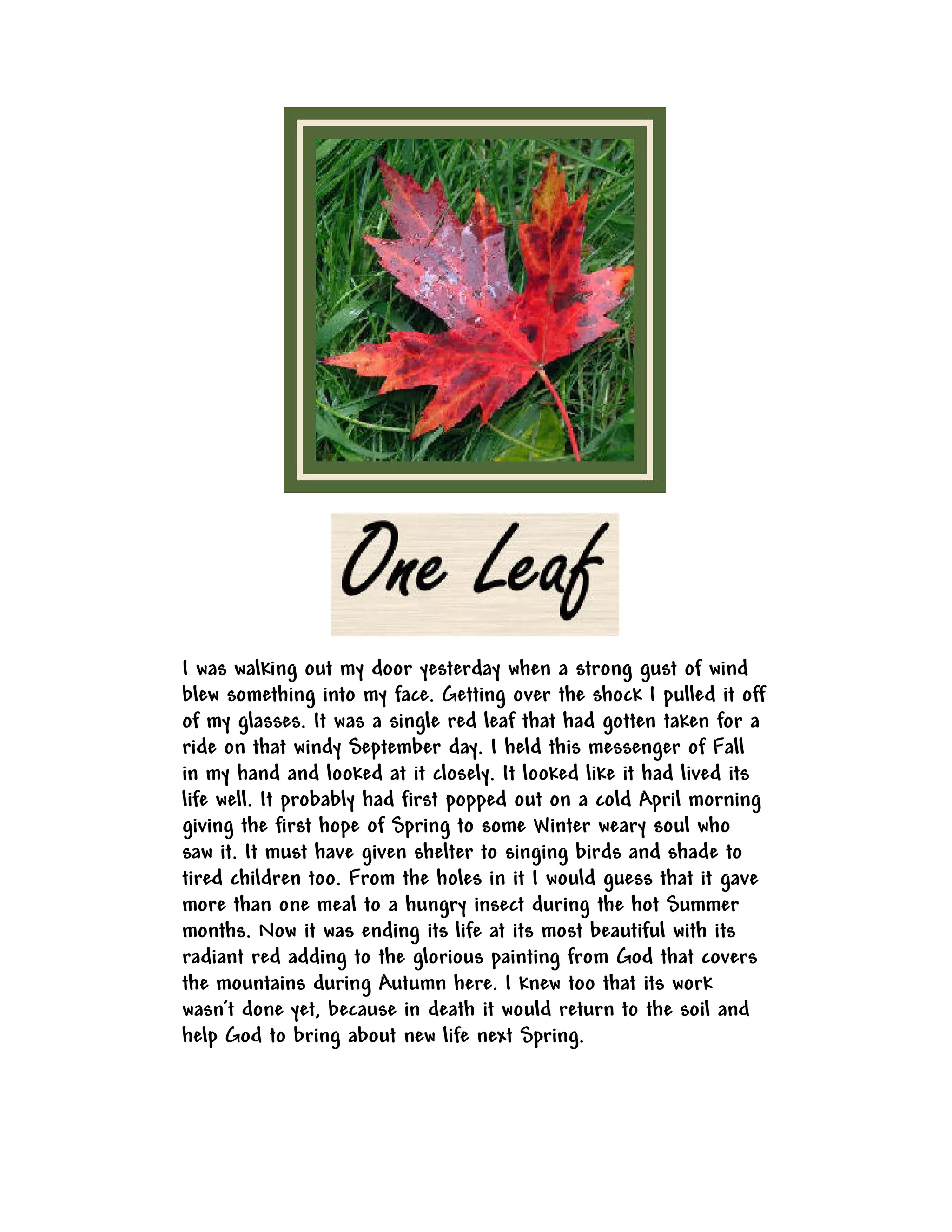 The narrator finds a single red leaf that had blown onto their face on a windy fall day. They observe the leaf closely and reflect on its life cycle, from providing shade and shelter in spring and summer to ending its life beautifully in autumn. The leaf reminds the narrator that even one small thing can do much good, and inspires them to live their own life to the fullest by helping and giving comfort to others. The document encourages the reader to share their beauty with the world and commit to living fully each day.