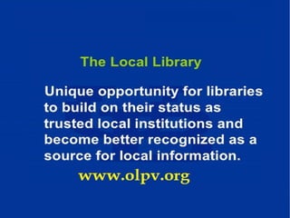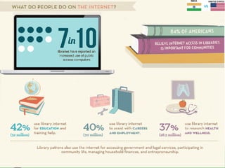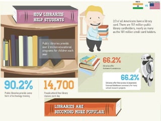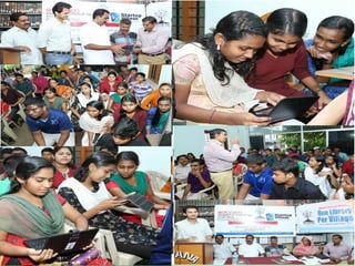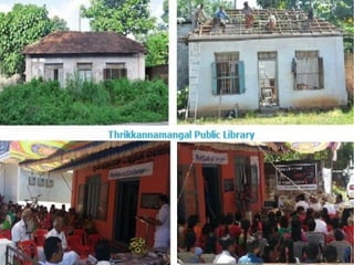The document discusses the transformation of village libraries into community learning centers in India to address educational disparities, highlighting that 70% of the population lives in villages with limited library access. It emphasizes the importance of equal access to information for empowerment, social progress, and bridging the digital divide. The initiative aims to create vibrant communities by providing resources for education, personal development, and critical inquiry, ultimately contributing to a more literate and prosperous society.