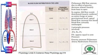 This document discusses one lung ventilation (OLV), which involves ventilating one lung while collapsing the other lung to provide surgical access. It begins by outlining the principles and history of OLV. It then discusses the advantages and absolute/relative indications for OLV. The document goes on to explain the changes in respiratory physiology and ventilation-perfusion matching that occur with OLV compared to two lung ventilation in various positions (awake, anesthetized, open chest). It also covers hypoxic pulmonary vasoconstriction and strategies to optimize oxygenation during OLV.