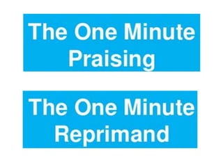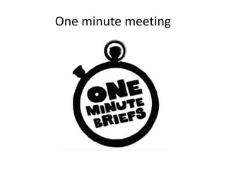 This document outlines a "One Minute Meeting" approach for managing people. It involves brief daily meetings between managers and individual employees, lasting one minute, to discuss team and personal goals, praise good performance, and address any issues. The meetings are meant to happen twice daily and focus the conversation on goals, specific praise or constructive feedback, and leaving the employee feeling respected and motivated. Some examples of team and personal goals are provided related to tasks like cleaning up, preparing activities, and engaging children in learning.