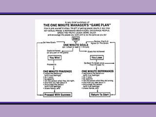 The document outlines the principles of One Minute Management, emphasizing three key techniques: setting one minute goals, providing one minute praise, and delivering one minute reprimands. These methods aim to enhance employee performance and motivation through clear expectations, timely feedback, and constructive criticism. The author shares personal experiences and encourages the importance of education for military personnel transitioning to civilian life.