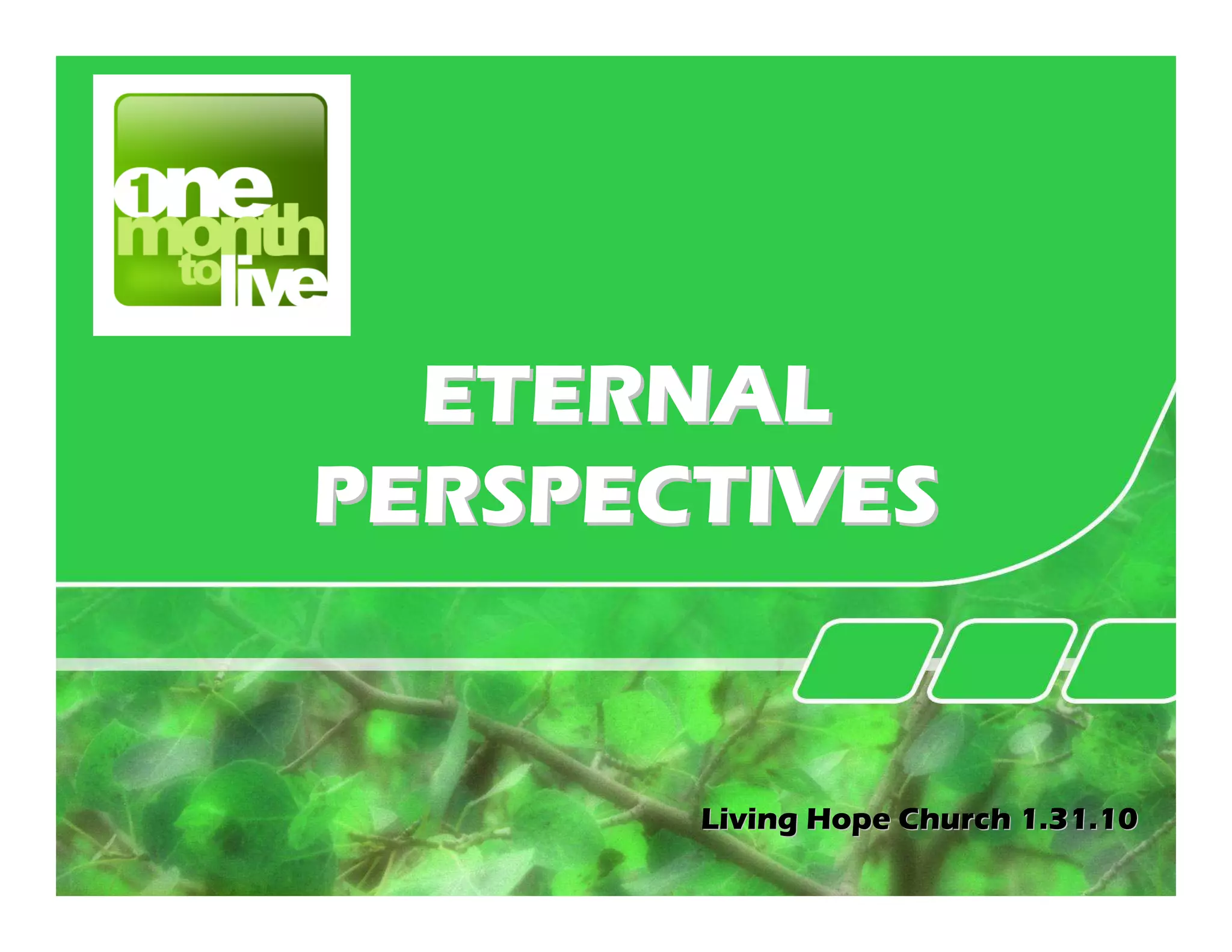 The document is a sermon focused on gaining eternal perspectives rather than worldly treasures. It encourages the reader to seek treasures in heaven through generosity and focusing on eternal matters like God rather than materialism and possessions. Key Bible passages discuss how life is short, we should store treasures in heaven through good works, seek God's kingdom first, and consider worldly gains as loss compared to knowing Christ. The overarching message is to pursue eternal perspectives over temporary earthly desires.
