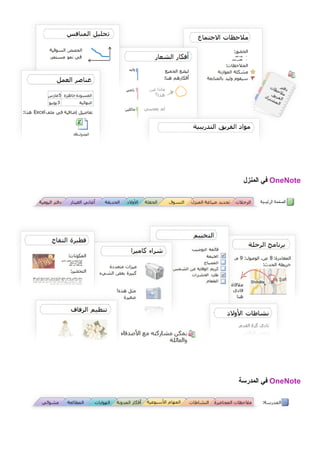 يتناول المستند ميزات استخدام onenote في بيئات العمل، المنزل، والمدرسة، موضحًا كيفية الكتابة والتنظيم والمشاركة. يبرز الوثيقة أدوات متعددة للتخصيص والبحث، مما يسهل إدارة الملاحظات والمعلومات. كما يشير إلى ميزات جديدة في الإصدار الأخير، مثل تحسينات البحث ومشاركة المحتوى.