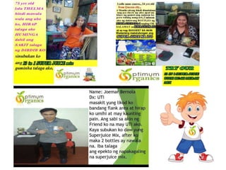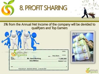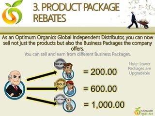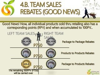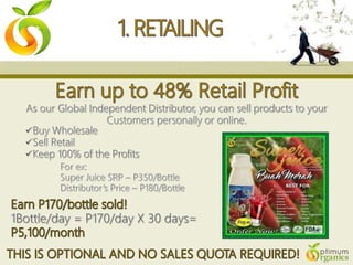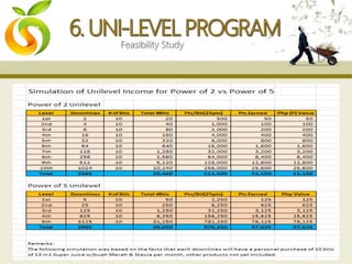 This document summarizes the compensation plan and product offerings of a multi-level marketing company selling a "14 in 1 Mix" super juice product. It describes 3 membership tiers (Silver, Gold, and Platinum) that provide different product packages and commissions. Members earn commissions from their own sales and a percentage of sales from members they recruit in their team. The higher tiers provide larger product packages, commissions, and bonuses for recruiting other members.