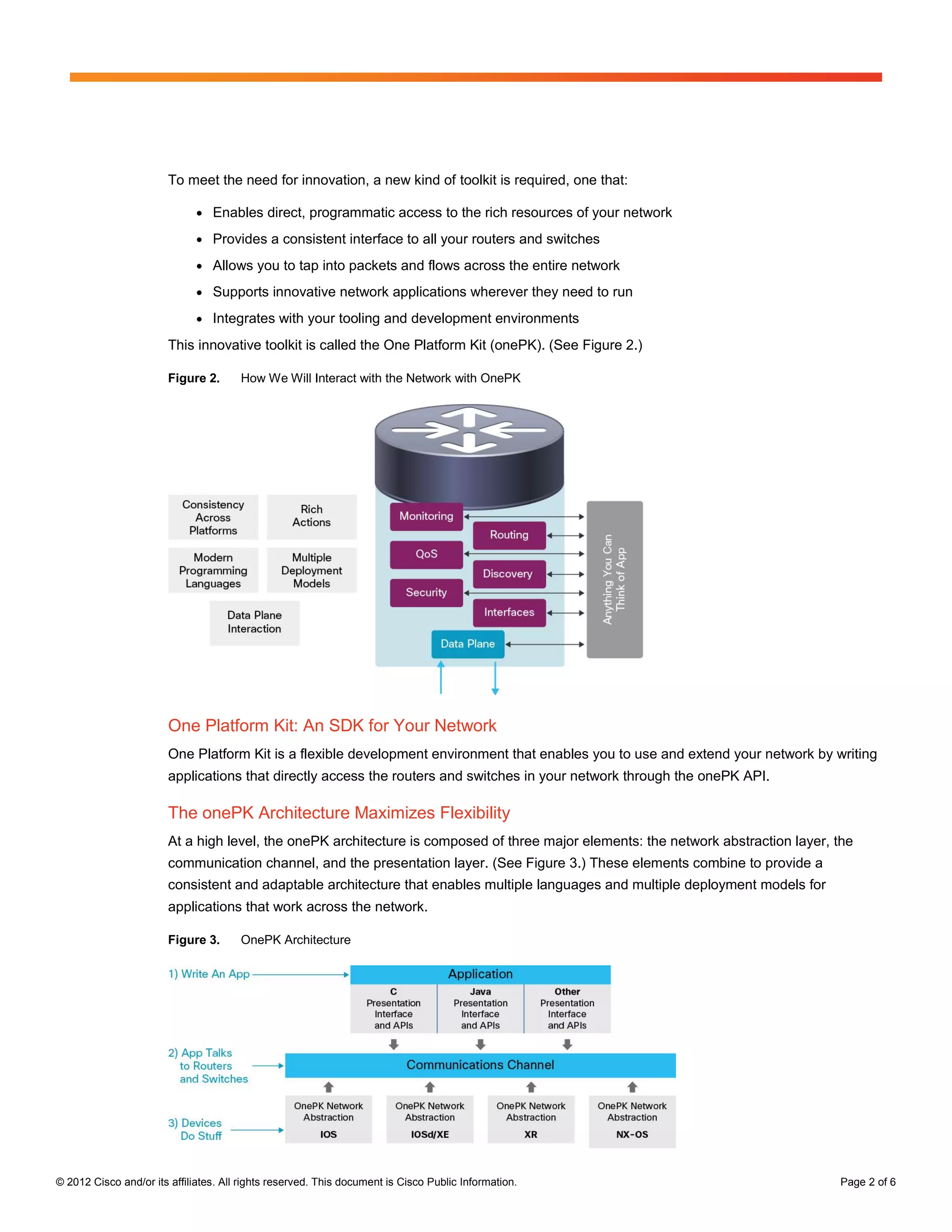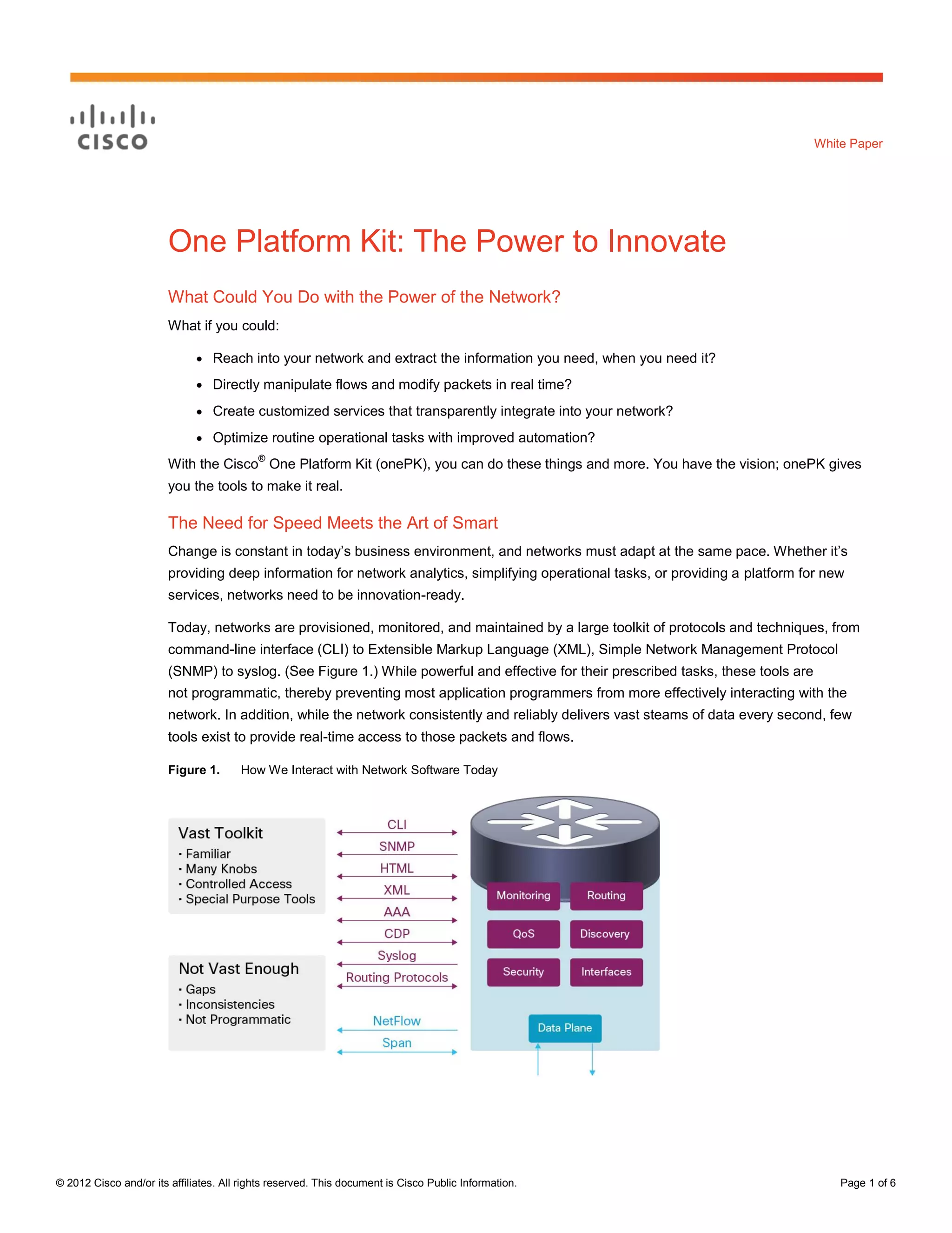 The document introduces the Cisco One Platform Kit (onePK), which provides developers with tools to programmatically access and manipulate network resources. OnePK includes an SDK that standardizes access across different Cisco platforms through a common API. It allows applications to run on network devices or external servers. The onePK architecture provides flexibility in programming languages, device access, and deployment models. Key capabilities enabled include network analytics, automation, and new customized services.