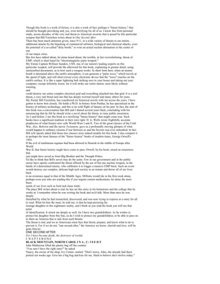 This document provides background information and acknowledgments for the novel "One Second After" by William R. Forstchen. It thanks many people who provided advice and inspiration for writing the book, including Newt Gingrich, military experts, and the author's friends and family. It also includes a foreword by Newt Gingrich describing the real threat of electromagnetic pulse weapons and how this novel aims to raise awareness of that threat through a fictional story about what might happen if such a weapon was used to destroy the U.S. electrical grid. The document concludes by setting up the beginning of the story, describing a father buying Beanie Babies as a gift for his daughter's 12th birthday.