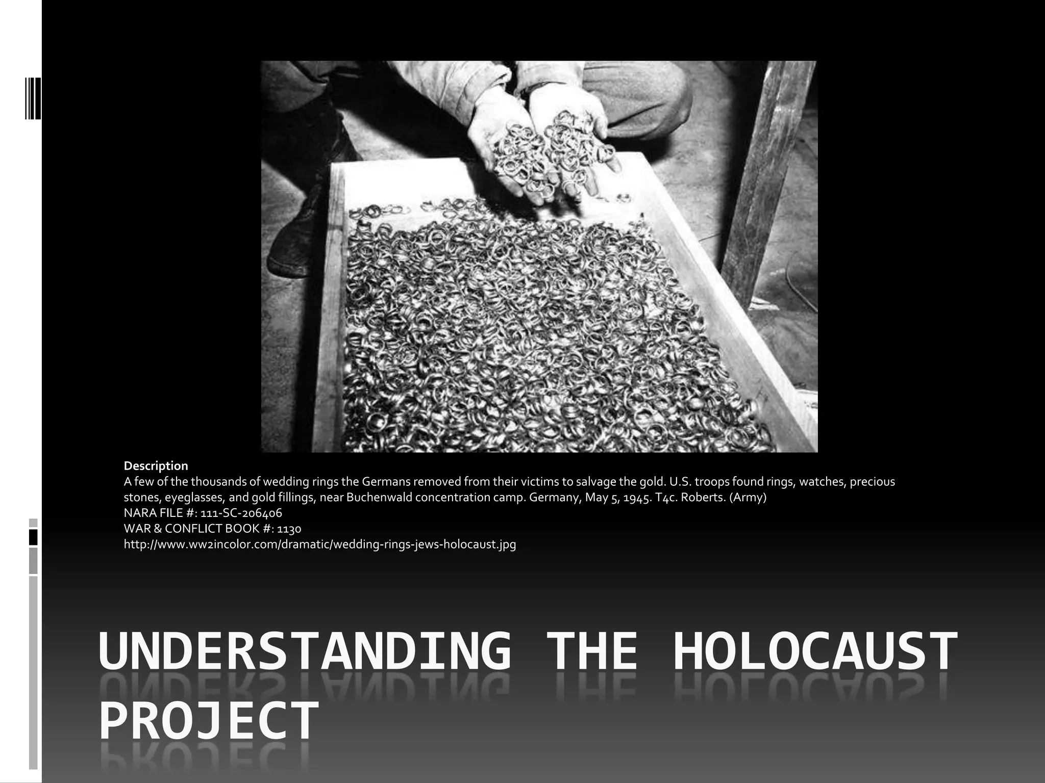 The document describes the discovery of wedding rings and other valuables that German troops removed from Holocaust victims near Buchenwald concentration camp on May 5, 1945. The items included rings, watches, precious stones, eyeglasses, and gold fillings. This finding highlights the atrocities committed during the Holocaust.