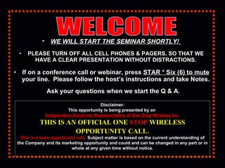 The document summarizes a seminar about joining the One Stop Wireless business opportunity. It describes affordable wireless plans with no contracts or fees, and earning income by signing up as a dealer and receiving commissions on sales. Recruiting others allows building a team to earn additional bonuses and create long term residual income.
