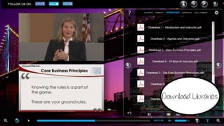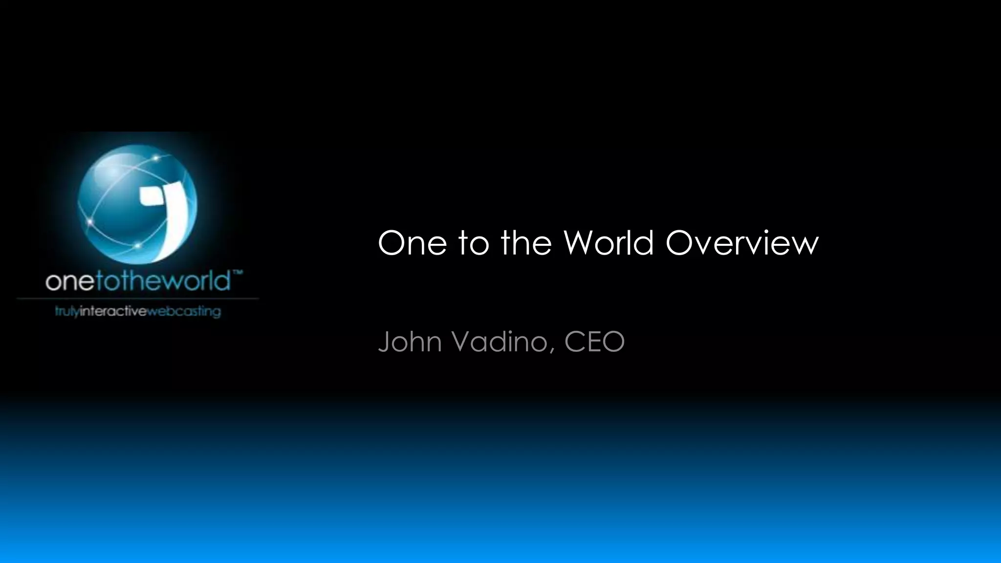 The document discusses One to the World, a webcasting platform that allows businesses to connect with employees, customers, and partners through online webcasts. It describes One to the World as being intuitive and interactive for users, easy and robust for producers, and scalable and manageable. Key features include requiring no software downloads through use of HTML5, dual video and interactive panels, and powerful post-production editing capabilities. It positions One to the World as a purpose-built solution for webcasts compared to existing platforms evolved from web conferencing that may require specialized hardware or technical resources.