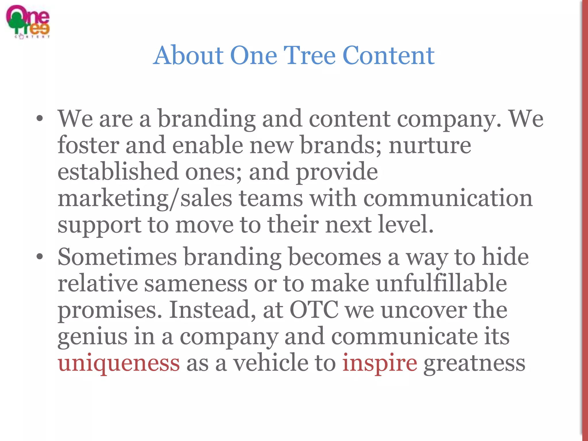 One Tree Content is a branding and content company that helps foster new brands and support established brands. They provide various branding and marketing services including positioning, branding, strategic planning, design, social media, and events. The document describes a case study where One Tree Content helped rebrand a B2B IT outsourcing company's website, which improved their visibility and lead generation and eventually led to an acquisition. It then outlines One Tree Content's key processes like briefing, content mapping, and lead nurturing strategies.