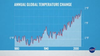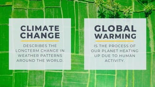 Global climate change is causing more extreme weather events like larger storms, worse wildfires, and changing weather patterns due to human activities that release greenhouse gases. The main causes of this climate change are population growth which leads to deforestation and resource depletion, increased consumption and waste production, and industrialized food systems. Individual choices that consume fewer resources and produce less waste and pollution can help address this global problem.