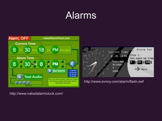 This document provides a list of one trick productivity tools organized into categories including alarms, backchannels, backup tools, email schedulers, link checkers, WiFi finders, meeting schedulers, PDF converters, polling tools, paper printers, read later tools, reminders, speed reading, status checkers, white noise generators, and YouTube editing tools. Each tool is briefly described and includes a URL. Over 30 different web-based productivity apps and services are highlighted.