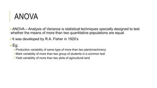 1. ANOVA compares the means of more than two populations to see if they are equal. It was developed by R.A. Fisher in the 1920s.