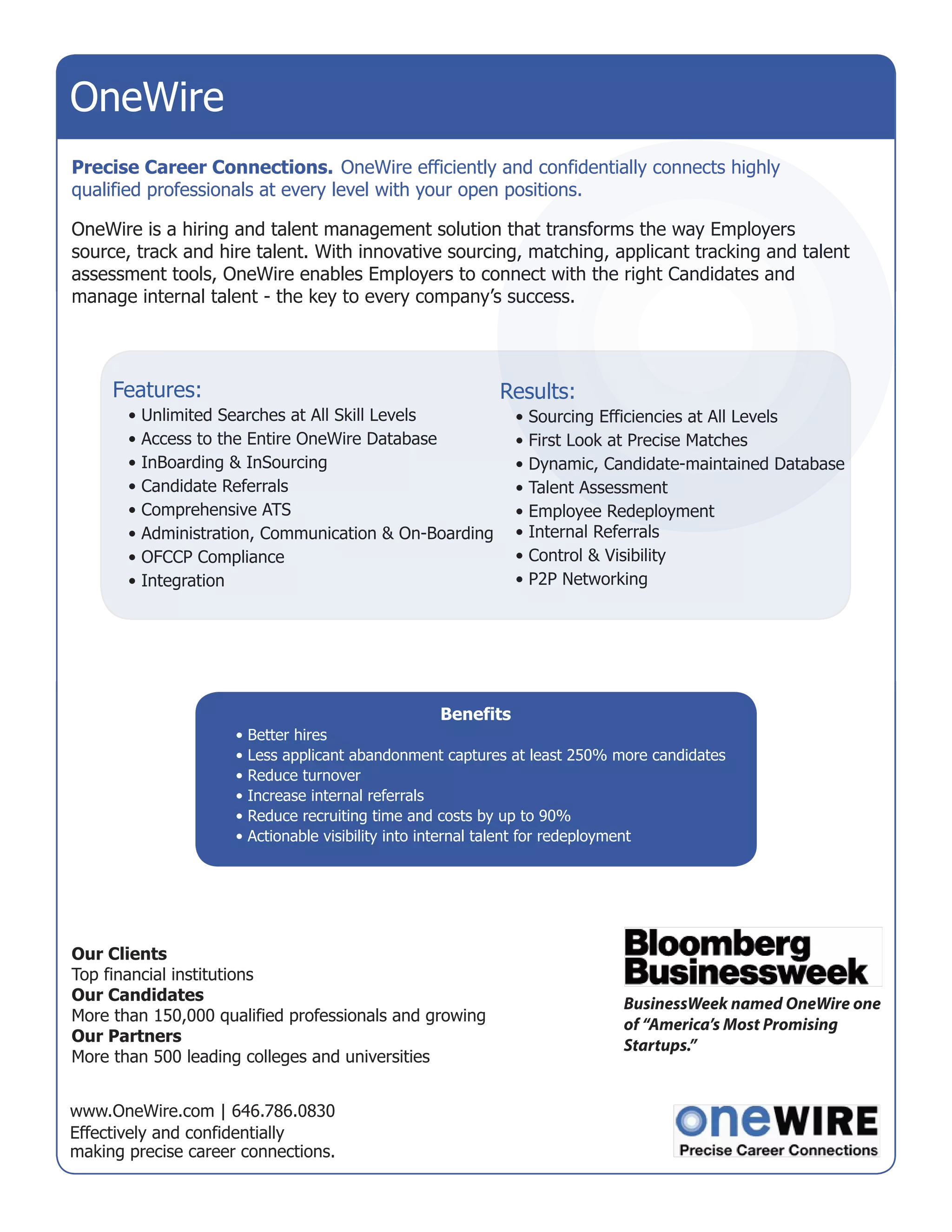 OneWire is a hiring and talent management solution that connects qualified professionals with open positions through innovative sourcing, matching, applicant tracking and talent assessment tools. It enables employers to source candidates efficiently from its database of over 150,000 professionals as well as track and manage the entire hiring process. Key benefits include reducing recruiting time and costs by up to 90% while improving hiring quality through precise matching of candidates to roles.