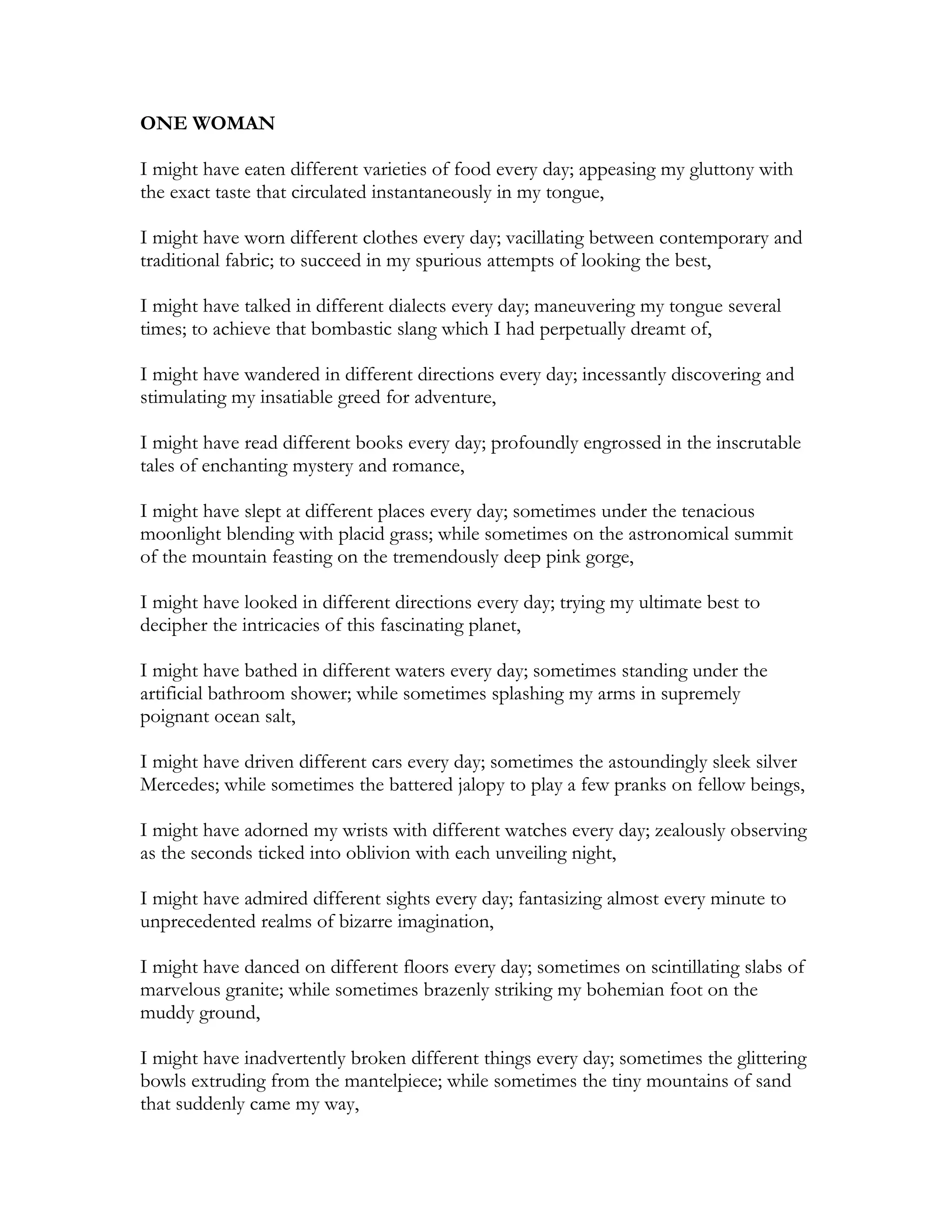 The passage describes how the narrator might have experienced many different things each day, such as eating different foods, wearing different clothes, speaking in different dialects, and more. However, the narrator declares that despite all these possible daily differences, they have loved only one woman with all their heart. This one woman is the essence that will continue to linger around the narrator's soul even after death.
