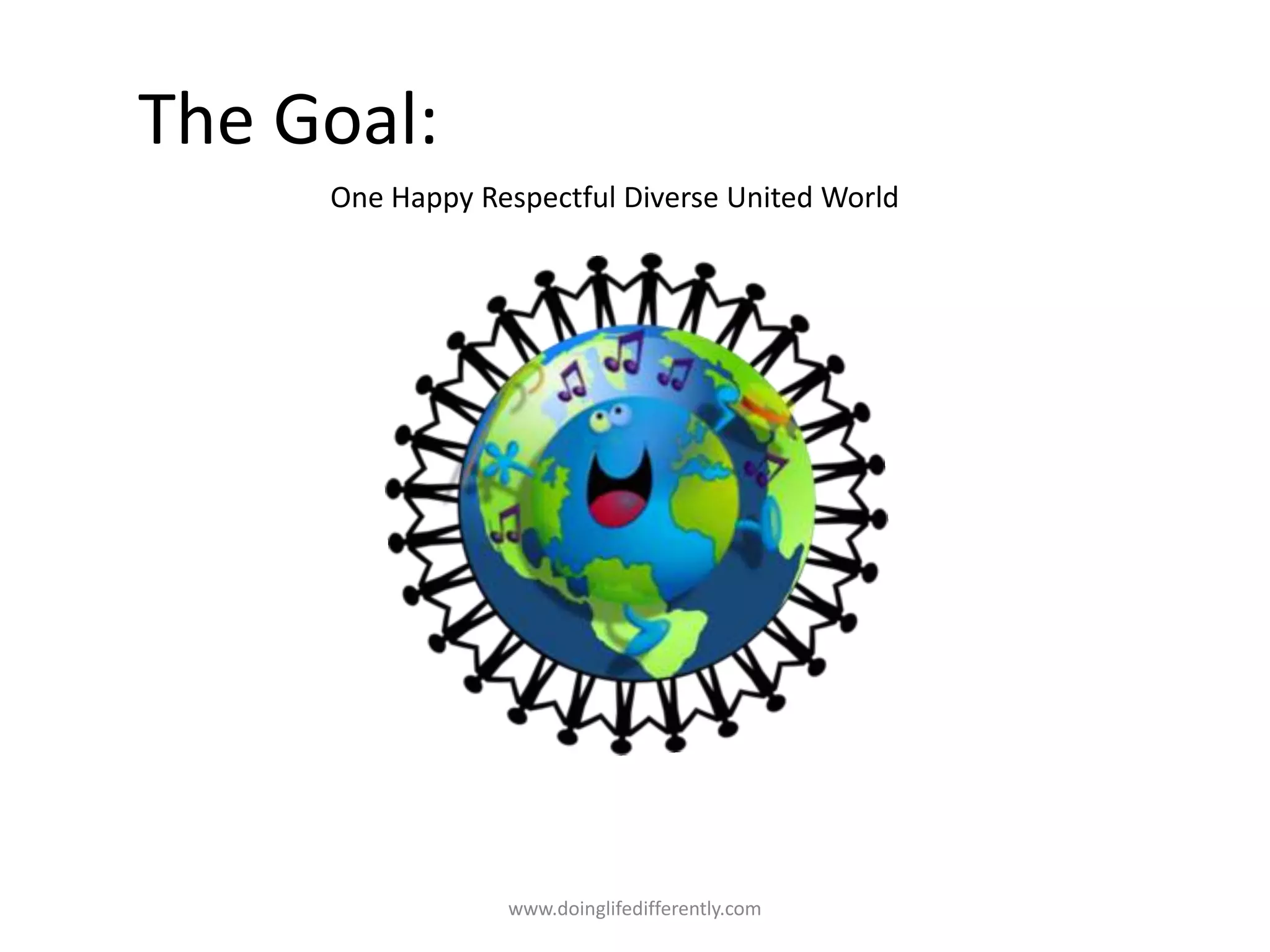 The document promotes a vision of a happy, respectful, and united world that celebrates diversity while advocating for acceptance and consideration among individuals. It emphasizes the importance of dreamers and the belief in the possibility of change, urging readers to prepare for collective efforts toward this ideal. The narrative contrasts personal perspectives with an open-minded approach to understanding diverse viewpoints.