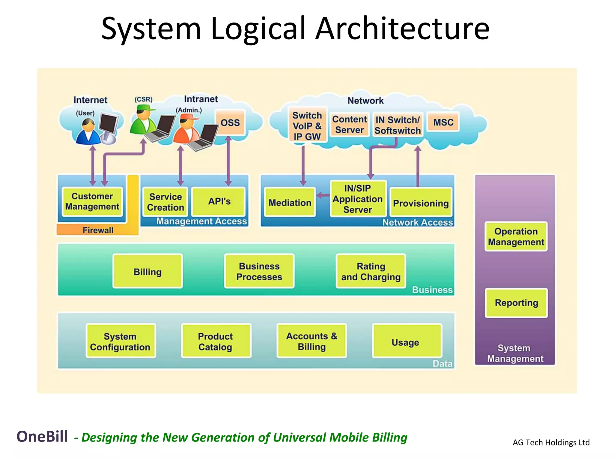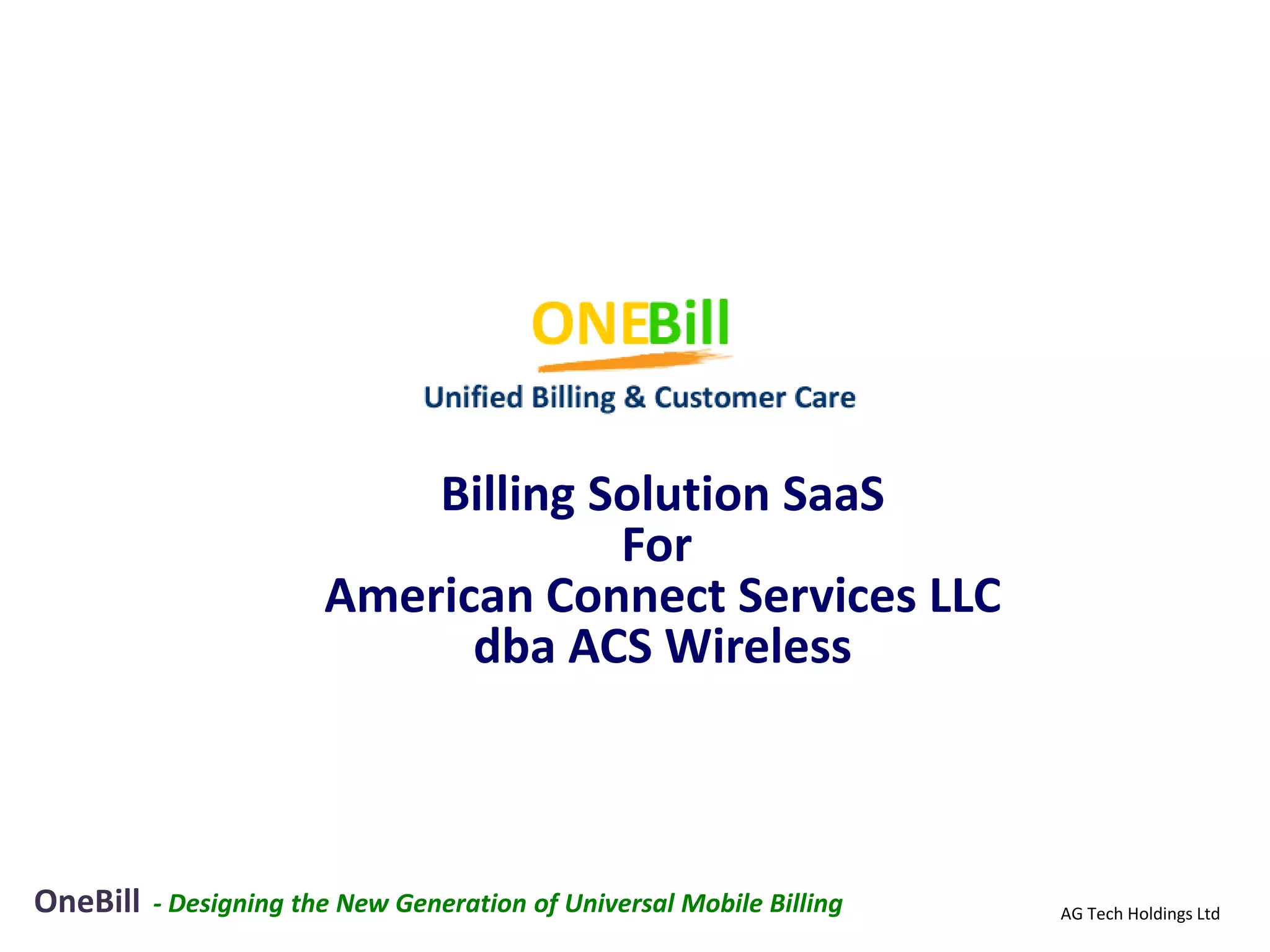 The document discusses various components of a billing solution including: