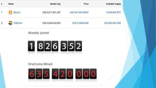OneCoin is a digital currency company that provides educational packages on cryptocurrency and allows users to mine OneCoins through their mining pools. It has grown rapidly since launching in 2014 and now has over 18 million members worldwide, ranking as the second largest digital currency. OneCoin differentiates itself from Bitcoin by having a larger total coin supply backed by gold, and by building business partnerships and a merchant network from the start to facilitate real-world use of OneCoins. The company aims to eventually make OneCoin a mainstream cryptocurrency accepted globally on par with Bitcoin.