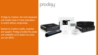 The document describes Prodigy by Crestron, a home automation system offering control over audio, video, lighting, and climate with an easy setup process. It highlights features such as a handheld remote, touch panel support, and web-based control accessible from mobile devices. Prodigy eliminates the need for complicated design or programming, allowing users to quickly configure their systems using simple software wizards.