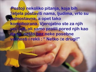 Dokument se bavi problematikom onečišćenja okoliša i posljedicama ljudskih aktivnosti koje negativno utječu na prirodu. Ističe kako zagađenje tla, zraka i vode ugrožava prirodne resurse i bioraznolikost, te poziva na svjesnost i očuvanje prirode. Autorice upozoravaju da će planeta pretrpjeti ozbiljne posljedice ako se nastavi s neodrživim razvojem.