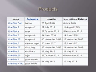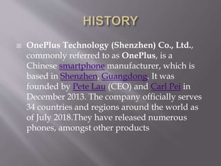 OnePlus Technology is a Chinese smartphone manufacturer founded in 2013 by Pete Lau and Carl Pei. Lau previously worked at Oppo Electronics in various roles, while Pei worked at Nokia, Meizu, and Oppo before co-founding OnePlus. OnePlus focuses on design, user experience, and building technology with customers. Early OnePlus phones were only available through an invite system due to high demand. The company has since expanded globally and improved its customer support.