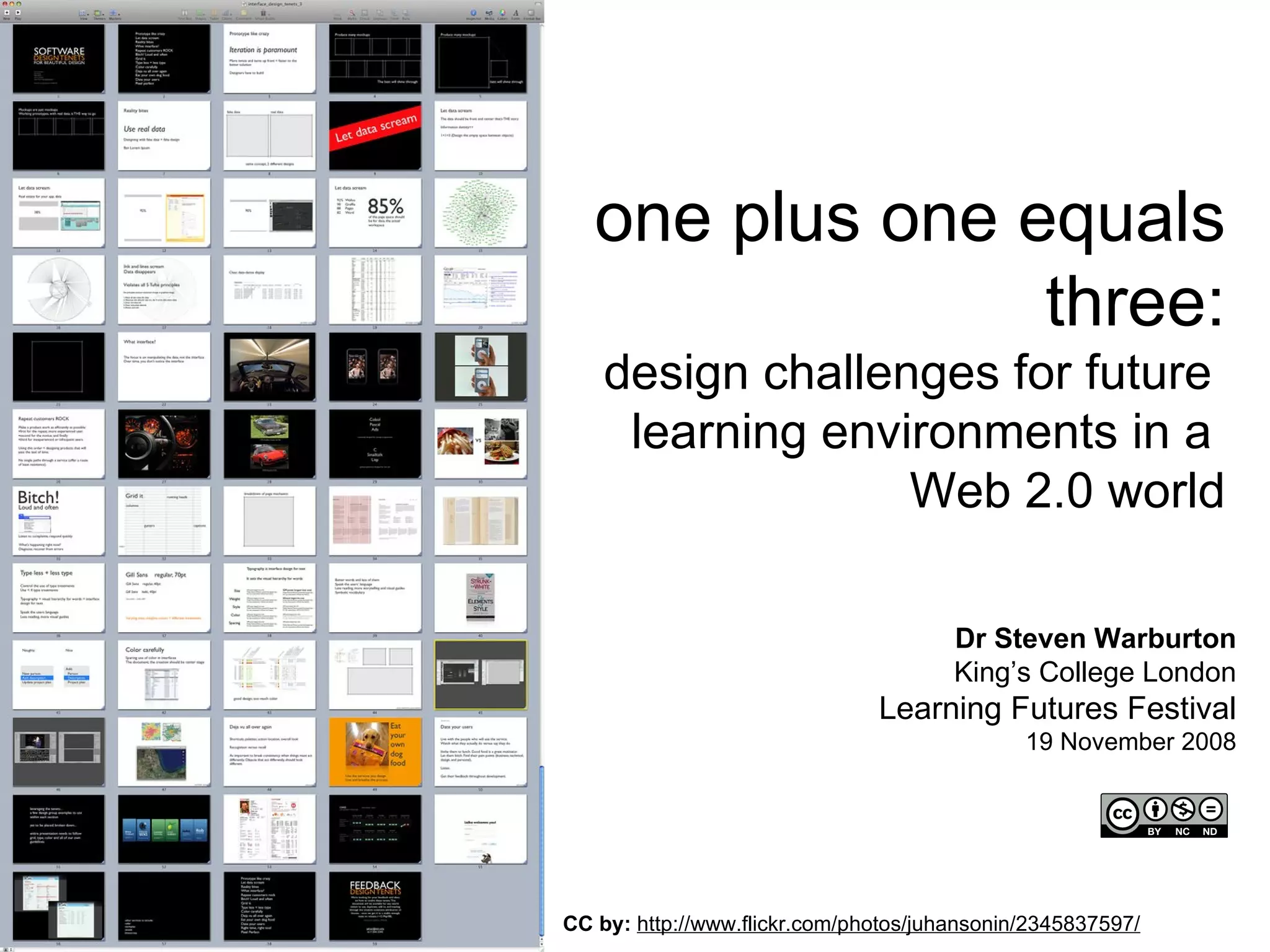 The document discusses design challenges for future learning environments in a Web 2.0 context, emphasizing the role of social software and its impact on education. It highlights the conflict between traditional and informal learning spaces, the characteristics of learners and teachers, and the evolving nature of educational practices and tools. Furthermore, it raises questions about balancing structure and freedom in learning design, as well as issues of participation, power dynamics, and knowledge dissemination in digital spaces.