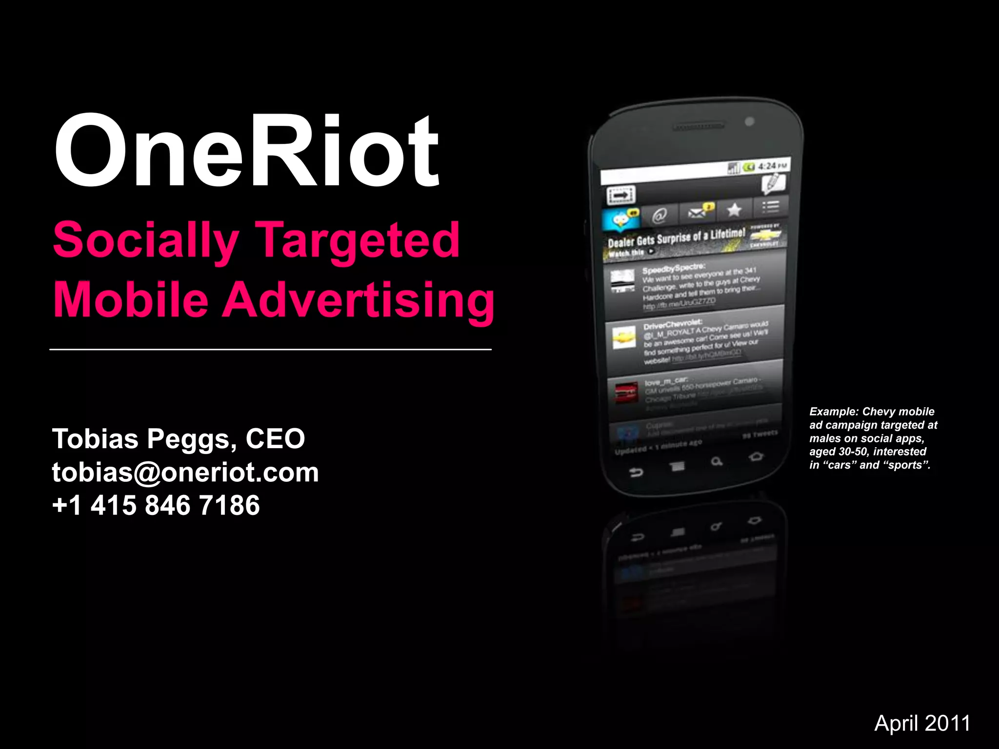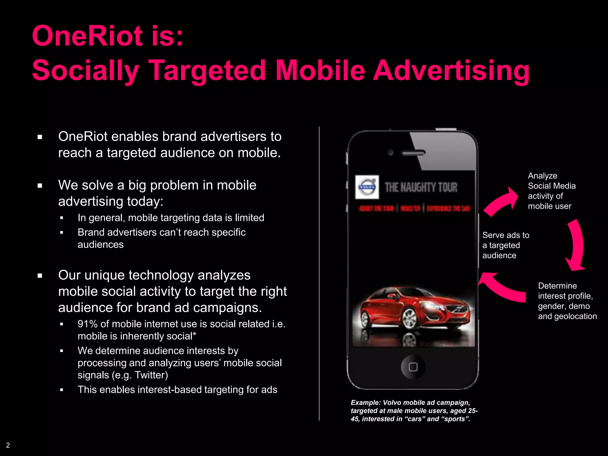 OneRiot provides socially targeted mobile advertising by analyzing users' social media activity to determine their interests, demographics, and location in order to serve targeted ads. For example, a Chevy campaign targeted males aged 30-50 on social apps interested in cars and sports. OneRiot's technology analyzes mobile social activity like Twitter to build interest profiles and target the right audience for brand campaigns.