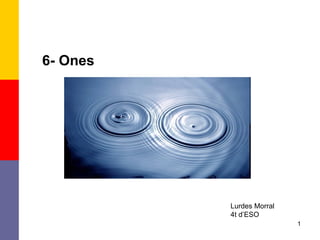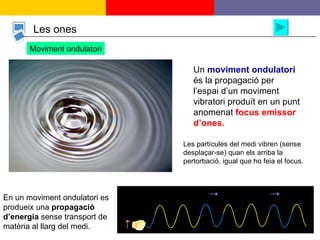 Les ones Movimentondulatori Un moviment ondulatori és la propagació per l’espai d’un moviment vibratori produït en un punt anomenat focus emissor d’ones. Les partícules del medi vibren (sense desplaçar-se) quan els arriba la pertorbació, igual que ho feia el focus. En un moviment ondulatori es produeix una propagació d’energia sense transport de matèria al llarg del medi.