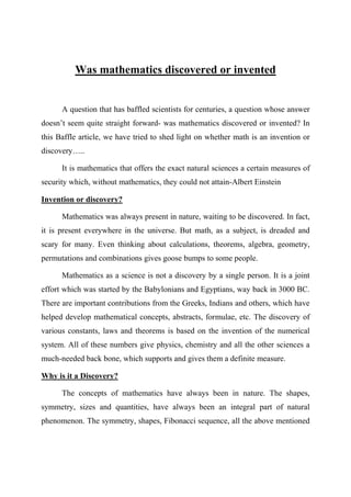 Mathematics appears to be both discovered and invented. While mathematical concepts like shapes, sizes and quantities have always existed in nature and been waiting to be discovered, many mathematical tools, systems and theories have been invented by humans over centuries to help develop mathematics as a formal science. Key inventions include numerical systems, abstraction of concepts, and tools like the abacus, while mathematical objects and patterns in nature have been discovered through observation and study. Overall, mathematics has advanced through both the discovery of principles present in the universe and the invention of tools and ideas to formally express and apply these principles.