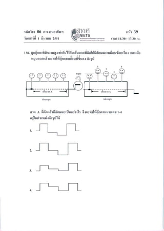 1 มีนาคม 2551 หน้า 38 เวลา 14.30 - 17.30 น. 135. "บริษัทผลิตผลไม้แปรรูปแห่งหนึงได้ศึกษาวัฒนธรรมการกินของคนจีนเพือใช้เป็น ่ ่ แนวทางพัฒนาลำไยแปรรูปที่จะส่งไปขายยังประเทศจีน" การศึกษาวัฒนธรรมการกินของคนจีนเป็นขันตอนใดในกระบวนการเทคโนโลยี ้ 1. กำหนดปัญหา 2. รวบรวมข้อมูล 3. เลือกวิธการ ี 4. ปรับปรุงแก้ไข 136. ข้อใดเป็นการเรียงลำดับวิวัฒนาการของวงจรคอมพิวเตอร์จากอดีตจนถึงปัจจุบน ั 1. หลอดสุญญากาศ , วงจรไอซี , ทรานซิสเตอร์ , วงจรรวมความจุสง ู 2. ทรานซิสเตอร์ , หลอดสุญญากาศ , วงจรไอซี , วงจรรวมความจุสง ู 3. หลอดสุญญากาศ , ทรานซิสเตอร์ , วงจรไอซี , วงจรรวมความจุสง ู 4. ทรานซิสเตอร์ , วงจรไอซี , หลอดสุญญากาศ , วงจรรวมความจุสง ู 137. ทำไมอุปกรณ์คอมพิวเตอร์จึงใช้ระบบเลขฐานสอง 1. เนื่องจากอุปกรณ์คอมพิวเตอร์ใช้ภาษาเครื่อง 2. เนืองจากอุปกรณ์คอมพิวเตอร์ไม่เข้าใจภาษามนุษย์ ่ 3. เนืองจากอุปกรณ์คอมพิวเตอร์เป็นอุปกรณ์อเิ ล็กทรอนิกส์ททำงาน ่ ่ี แบบแอนะล็อก 4. เนื่องจากอุปกรณ์คอมพิวเตอร์เป็นอุปกรณ์อิเล็กทรอนิกส์ที่ทำงานแบบดิจิทัล โดยใช้แรงดันไฟฟ้าแสดงสถานะเพียงสองสถานะ