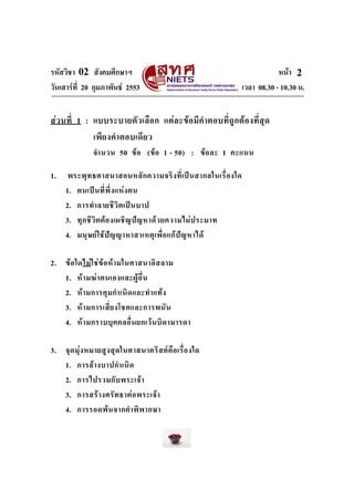 หนา 2 วันเสารที่ 20 กุมภาพันธ 2553 เวลา 08.30 - 10.30 น. ส วนที่ 1 : แบบระบายตั ว เลื อ ก แต ล ะขอ มี คําตอบที่ ถู ก ต อ งที่สุ ด เพี ยงคํา ตอบเดี ยว จํา นวน 50 ข อ (ข อ 1 - 50) : ข อ ละ 1 คะแนน 1. พระพุ ท ธศาสนาสอนหลั ก ความจริ ง ที่ เ ป น สากลในเรื่ อ งใด 1. ตนเป น ที่ พึ่ ง แห ง ตน 2. การทํา ลายชี วิ ต เป น บาป 3. ทุ ก ชี วิ ต ต อ งเผชิ ญ ป ญ หาด ว ยความไม ป ระมาท 4. มนุ ษ ย ใ ช ปญ ญาหาสาเหตุ เ พื่ อ แก ป ญ หาได 2. ข อ ใดไม ใ ชข อ ห า มในศาสนาอิ ส ลาม 1. ห า มฆ า ตนเองและผู อื่ น 2. ห า มการคุ ม กํา เนิ ด และทํา แท ง 3. ห า มการเสี่ย งโชคและการพนั น 4. ห า มกราบบุ ค คลอื่ น ยกเว น บิ ด ามารดา 3. จุ ด มุ ง หมายสู ง สุ ด ในศาสนาคริ ส ต คื อ เรื่ อ งใด 1. การล า งบาปกํา เนิ ด 2. การไปรวมกั บ พระเจ า 3. การสร า งศรั ท ธาต อ พระเจ า 4. การรอดพ น จากคํา พิ พ ากษา