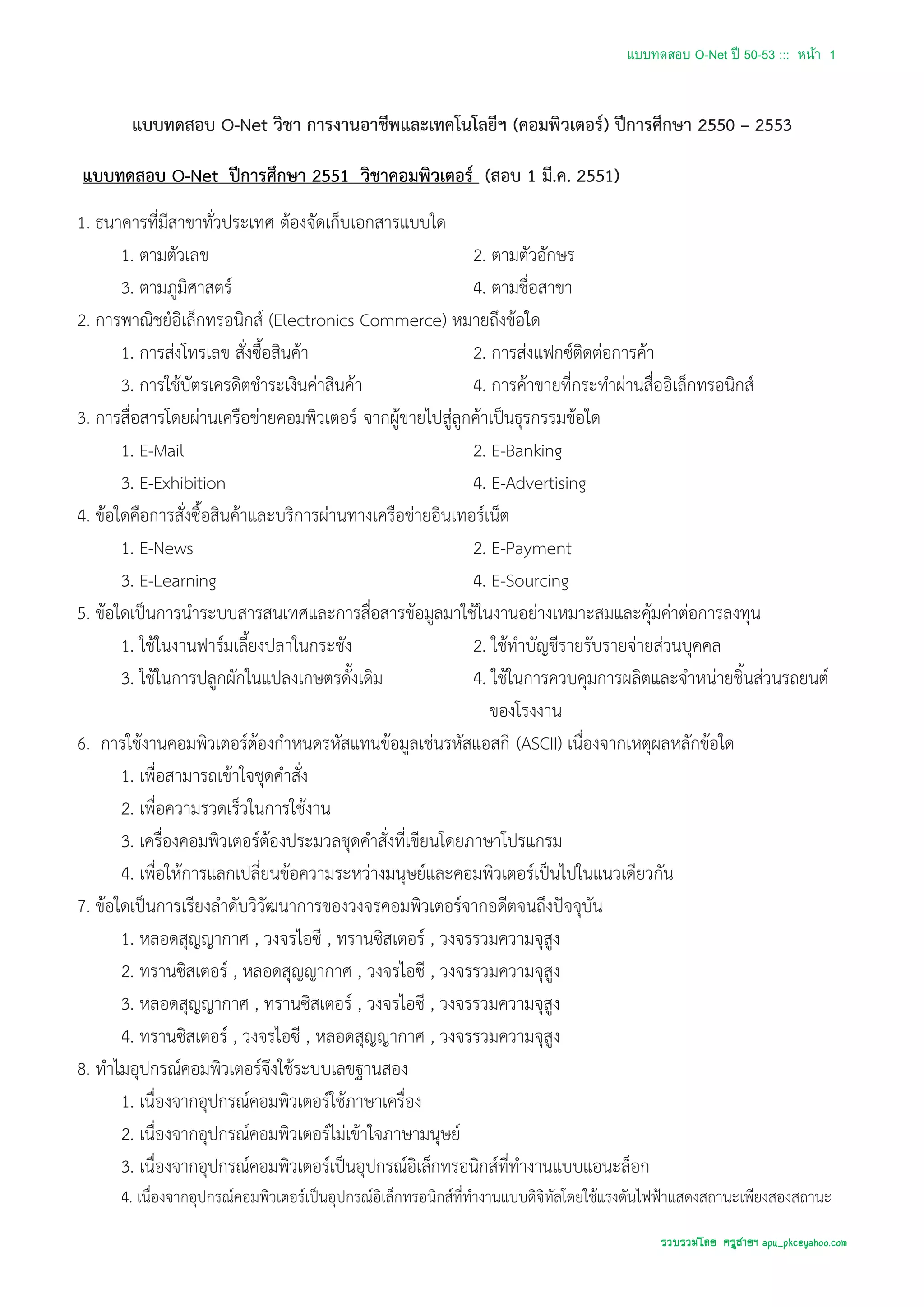 50-53 ::: หน้า 1 แบบทดสอบ O-Net วิชา การงานอาชีพและเทคโนโลยีฯ (คอมพิวเตอร์) ปีการศึกษา 2550 – 2553 แบบทดสอบ O-Net ปีการศึกษา 2551 วิชาคอมพิวเตอร์ (สอบ 1 มี.ค. 2551) 1. ธนาคารที่มีสาขาทั่วประเทศ ต้องจัดเก็บเอกสารแบบใด 1. ตามตัวเลข 2. ตามตัวอักษร 3. ตามภูมิศาสตร์ 4. ตามชื่อสาขา 2. การพาณิชย์อิเล็กทรอนิกส์ (Electronics Commerce) หมายถึงข้อใด 1. การส่งโทรเลข สั่งซื้อสินค้า 2. การส่งแฟกซ์ติดต่อการค้า 3. การใช้บัตรเครดิตชาระเงินค่าสินค้า 4. การค้าขายที่กระทาผ่านสื่ออิเล็กทรอนิกส์ 3. การสื่อสารโดยผ่านเครือข่ายคอมพิวเตอร์ จากผู้ขายไปสู่ลูกค้าเป็นธุรกรรมข้อใด 1. E-Mail 2. E-Banking 3. E-Exhibition 4. E-Advertising 4. ข้อใดคือการสั่งซื้อสินค้าและบริการผ่านทางเครือข่ายอินเทอร์เน็ต 1. E-News 2. E-Payment 3. E-Learning 4. E-Sourcing 5. ข้อใดเป็นการนาระบบสารสนเทศและการสื่อสารข้อมูลมาใช้ในงานอย่างเหมาะสมและคุ้มค่าต่อการลงทุน 1. ใช้ในงานฟาร์มเลี้ยงปลาในกระชัง 2. ใช้ทาบัญชีรายรับรายจ่ายส่วนบุคคล 3. ใช้ในการปลูกผักในแปลงเกษตรดั้งเดิม 4. ใช้ในการควบคุมการผลิตและจาหน่ายชิ้นส่วนรถยนต์ ของโรงงาน 6. การใช้งานคอมพิวเตอร์ต้องกาหนดรหัสแทนข้อมูลเช่นรหัสแอสกี (ASCII) เนื่องจากเหตุผลหลักข้อใด 1. เพื่อสามารถเข้าใจชุดคาสั่ง 2. เพื่อความรวดเร็วในการใช้งาน 3. เครื่องคอมพิวเตอร์ต้องประมวลชุดคาสั่งที่เขียนโดยภาษาโปรแกรม 4. เพื่อให้การแลกเปลี่ยนข้อความระหว่างมนุษย์และคอมพิวเตอร์เป็นไปในแนวเดียวกัน 7. ข้อใดเป็นการเรียงลาดับวิวัฒนาการของวงจรคอมพิวเตอร์จากอดีตจนถึงปัจจุบัน 1. หลอดสุญญากาศ , วงจรไอซี , ทรานซิสเตอร์ , วงจรรวมความจุสูง 2. ทรานซิสเตอร์ , หลอดสุญญากาศ , วงจรไอซี , วงจรรวมความจุสูง 3. หลอดสุญญากาศ , ทรานซิสเตอร์ , วงจรไอซี , วงจรรวมความจุสูง 4. ทรานซิสเตอร์ , วงจรไอซี , หลอดสุญญากาศ , วงจรรวมความจุสูง 8. ทาไมอุปกรณ์คอมพิวเตอร์จึงใช้ระบบเลขฐานสอง 1. เนื่องจากอุปกรณ์คอมพิวเตอร์ใช้ภาษาเครื่อง 2. เนื่องจากอุปกรณ์คอมพิวเตอร์ไม่เข้าใจภาษามนุษย์ 3. เนื่องจากอุปกรณ์คอมพิวเตอร์เป็นอุปกรณ์อิเล็กทรอนิกส์ที่ทางานแบบแอนะล็อก 4. เนื่องจากอุปกรณ์คอมพิวเตอร์เป็นอุปกรณ์อิเล็กทรอนิกส์ที่ทางานแบบดิจิทัลโดยใช้แรงดันไฟฟ้าแสดงสถานะเพียงสองสถานะ รวบรวมโดย ครูสายฯ apu_pkc@yahoo.com