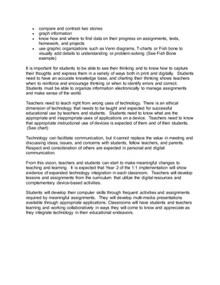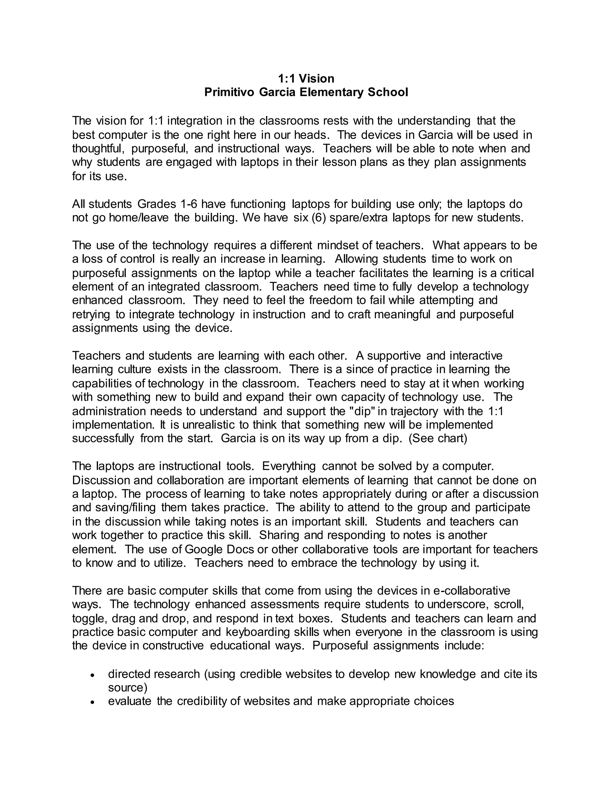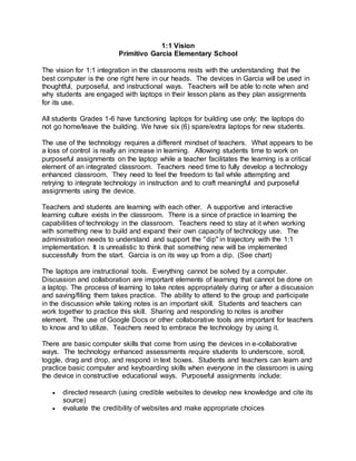 This document outlines the vision for a 1:1 laptop program at Primitivo Garcia Elementary School. It discusses how the laptops will be used purposefully for instruction and how teachers will integrate technology into their lesson plans. All students in grades 1-6 will have school-issued laptops for use in the classroom only. The administration recognizes that implementing new technology will cause initial difficulties but supports teachers through the process. The laptops are meant to enhance learning through activities like research, data analysis, and collaborative projects, while also developing students' computer skills. Teachers need time and freedom to learn how to best incorporate technology into their teaching. Both students and teachers will continue developing their technology skills together through the 1:1 initiative.