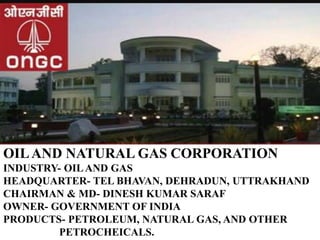 This document provides information about Deepak Chandak's summer industrial training at ONGC Ankleshwar. It includes details about ONGC such as its headquarters, chairman, products, assets, employees, and vision. It then describes ONGC Ankleshwar's fields, infrastructure like rigs, wells drilled, and departments. The document explains the process of oil formation, drilling including rig components and the drilling process, and production. It discusses costs associated with drilling rig E-1400-7 and concludes with thanks after learning about operations through site visits during the training.