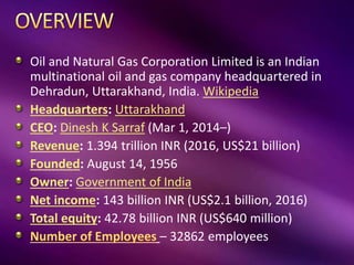 ONGC is an Indian state-owned oil and gas company headquartered in Dehradun, India. It was established in 1956 by the government of India to explore and produce oil and gas in India. ONGC operates both onshore and offshore oil/gas rigs and has international operations through its subsidiary ONGC Videsh. It is ranked as one of the largest national oil companies in the world. ONGC aims to be a global leader in integrated energy and retain its dominant position in India's energy sector through sustainable growth.