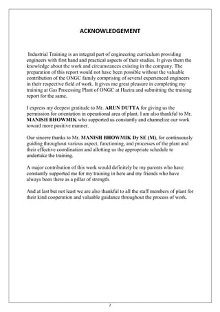 The document provides an overview of the Hazira Gas Processing Complex (HGPC) operated by ONGC in Gujarat, India. It discusses (1) the process of receiving sour gas and condensate from offshore fields through pipelines, separating them using slug catchers, and sending them to downstream units; (2) removing hydrogen sulfide from the sour gas using MDEA gas sweetening units to produce sweet gas; (3) further processing the sweet gas through dehydration and dew point depression units; and (4) recovering liquefied petroleum gas and other products from a portion of the sweet gas and condensate streams.