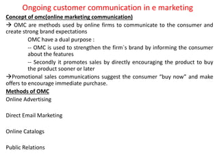 Ongoing customer communication in e-marketing involves using online marketing communication (OMC) methods to both strengthen brands and promote sales. OMC has two main purposes - to inform consumers about product features to build the brand, and directly encourage purchases. Common OMC methods include online advertising, direct email marketing, online catalogs, and public relations. Online advertising takes various forms like banners, paid search placements, sponsorships, and affiliate relationships. Effective communication blends both online and offline tactics to maximize results.