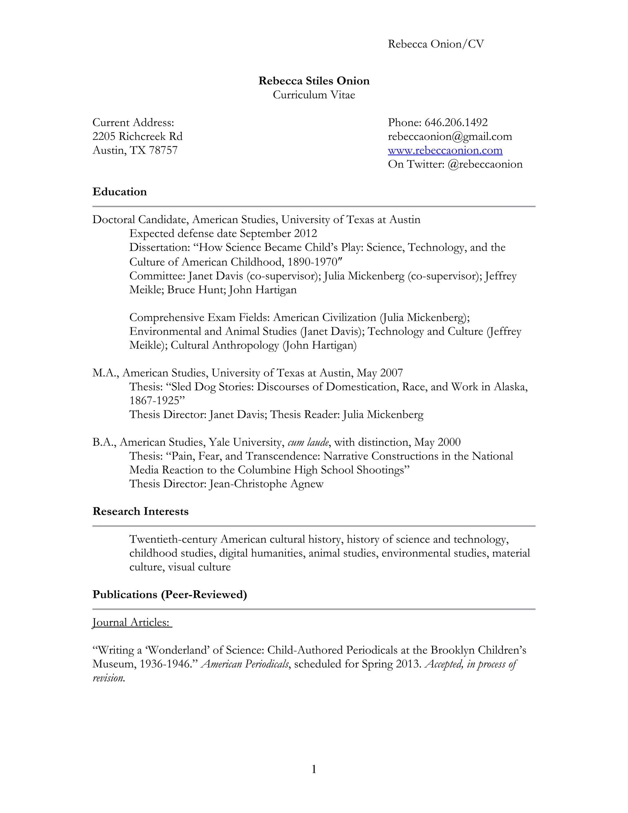 This CV summarizes Rebecca Onion's education, research interests, publications, fellowships and grants, scholarly honors, and digital humanities experience. She is a doctoral candidate in American Studies at the University of Texas at Austin, with research interests in the history of science, childhood studies, and digital humanities. Her publications include journal articles, book chapters, and reviews. She has received several fellowships and awards for her work. Her digital humanities experience includes maintaining an online scholarly presence and teaching courses that incorporate digital tools and archives.