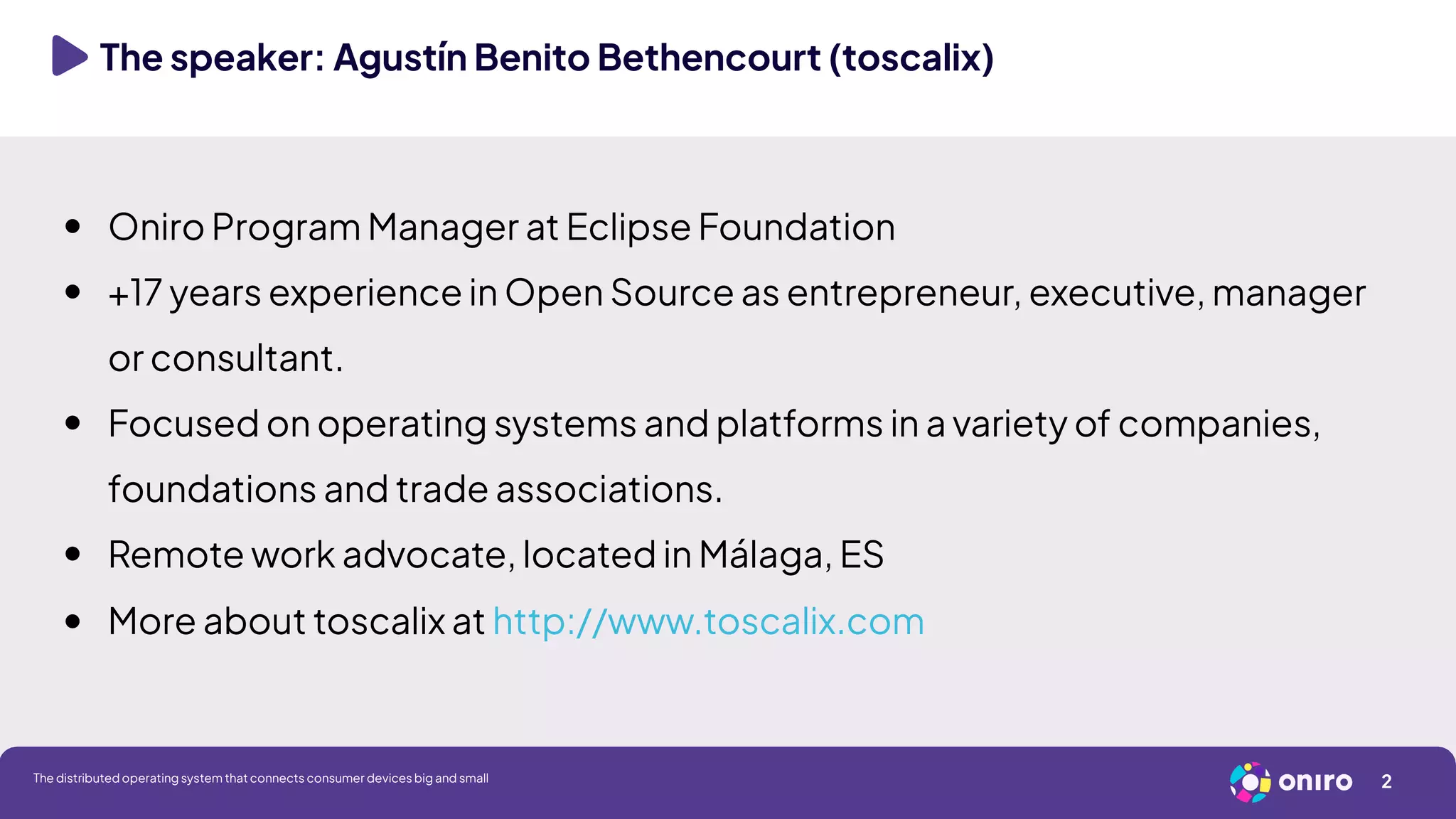 The document discusses Oniro, an open source distributed operating system project launched by the Eclipse Foundation that aims to connect consumer devices and reduce fragmentation by providing a unified set of configurations, APIs, and protocols for different devices. Oniro envisions evolving operating systems to cover more connected devices and provide a better user experience across devices. The Eclipse Foundation is establishing an Oniro Working Group to build an ecosystem around Oniro and drive its commercial success.