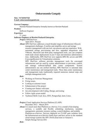 Onkurananda Ganguly is a Software Engineer at Hewlett Packard Enterprise with over 5 years of experience. He has worked on projects such as HPE OneView, Cloud Application Services Platform (CLASP), and BookPrep. For HPE OneView, his roles included working on firmware management, fixing issues, and enhancing features. He has technical skills in Java, J2EE, PostgreSQL, Junit, and Linux. Ganguly received his MCA degree in 2011 from W.B.U.T. with over 8% average and has experience in areas such as ASP.NET, Core Java, JSP, MySQL, C, C++, and data structures.