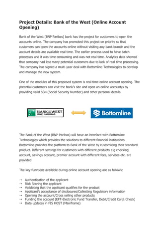 The Bank of the West has launched an online account opening project to enable customers to open accounts without visiting a branch, utilizing real-time processing to reduce customer loss due to previous delays. A multi-year partnership with Bottomline Technologies is set to provide the necessary system, which includes features like applicant authentication, risk scoring, and real-time account creation. The online application process involves multiple steps, including user verification and the option for customers to access additional financial products after account approval.