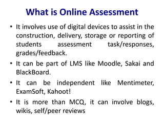 Online assessment involves using digital devices to construct, deliver, store, or report on student assessment tasks and responses. It provides benefits like efficiency through timeliness and automatic processing, as well as effectiveness through immediate feedback and new question types. Various online assessment formats are available, including MCQ, essays, drag and drop, ordering, blogs, discussions, and self/peer review. Popular examination tools include Kahoot!, Mentimeter, Google Forms, and e-portfolio platforms like Google Sites. Overall, online assessment facilitates engagement, identification of misunderstandings, flexibility, and enhanced social interactions.
