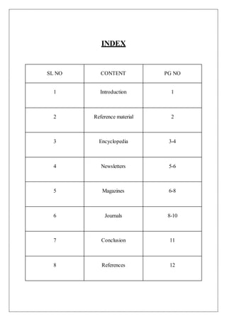 The document discusses different types of reference materials including encyclopedias, dictionaries, atlases, thesauruses, newsletters, magazines, and journals. It provides details on each type: encyclopedias contain summaries of knowledge in articles, newsletters are publications distributed within organizations, magazines are periodical publications on various topics financed by advertising, and journals are scholarly publications that are peer-reviewed. Reference materials are important sources that provide background information and facts on topics to support research.