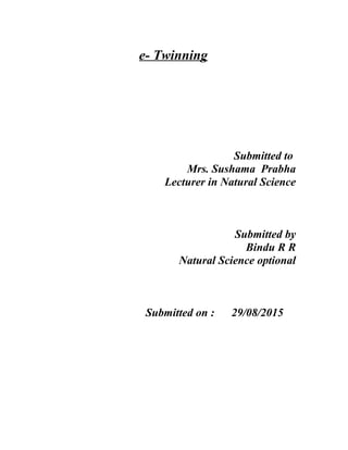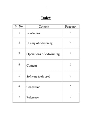 eTwinning is a European Union program that enables schools to partner together on projects using information and communication technologies. It provides schools with online tools like TwinSpace, a private forum for teachers and students to share files, communicate via messaging and chat. Over 230,000 members from schools across Europe participate in more than 5,000 projects annually through eTwinning to collaborate on various topics and help students learn skills like ICT and cultural awareness.