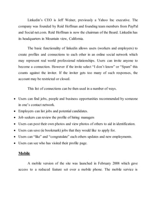 LinkedIn is a social networking site for professional connections. It was founded in 2002 and launched in 2003, and now has over 300 million members from around the world. The site allows users to create profiles, connect with colleagues and professionals, find jobs and business opportunities, and stay updated with other members' news feeds. While basic membership is free, LinkedIn is meant for professional networking among existing connections only. It has become a popular recruiting tool for employers and a job search resource for candidates.