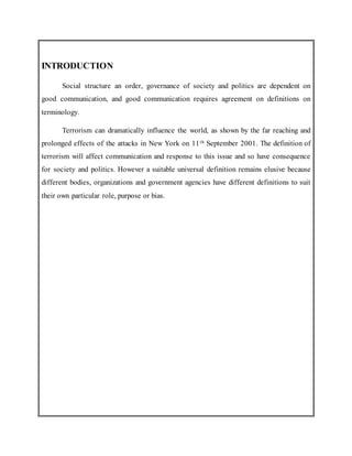 This document discusses definitions of terrorism from different perspectives and their implications. It examines definitions from international bodies, governments, law enforcement, counterterrorism groups, legal systems, and academics. While a universal definition has been elusive due to different biases and goals, the document emphasizes that terrorism involves premeditated violence against non-combatants for political, social, or psychological goals. Legal definitions are important for successful investigation and prosecution of terrorists, but they must balance security with civil liberties. Education is also discussed as significantly impacted by terrorism.